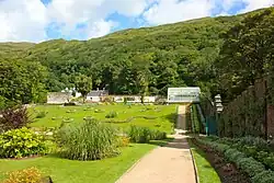 The Estate includes large walled Victorian Gardens. Since the 1970s these have been open for public tours and nature walks. The Benedictine community has restored the Abbey's gardens and church with donations and local artisans in order to be a self-sustaining estate. The gardens include a Kitchen Garden and a flower garden, the original walled garden was laid out by head gardener, James Garnier in 1870.[12] A complete restoration commenced in 1995.[13]
