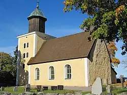 The church is one of the smallest in the diocese. It is a simple hall church with a medieval nave and sacristy.[3] The construction material is fieldstone, and the roof is made of shake. Internally, the church is characterised by the undecorated walls, the flat ceiling and the curious pulpit, built in 1753 on top of a medieval altar and constructed by carpenter Magnus Granlund.[1][2] The latter reflects a pietist tradition within Lutheranism that places the oral sermon in the centre of the life of the church.[1] A triumphal cross from the 12th century originally from Läby Church is currently on display at the Swedish History Museum.[2]