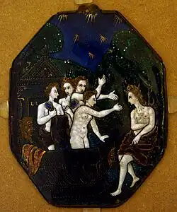 In 1530 he entered the service of Francis I as painter and varlet de chambre, a position which he retained under Henry II. For both these monarchs he executed many portraits in enamel—among them quite a number of plaques depicting Diane de Poitiers in various characters, plates, vases, ewers, and cups, besides decorative works for the royal palaces, for, though he is best known as an enameller distinguished for rich color, and for graceful designs in grisaille on black or bright blue backgrounds, he also enjoyed a great reputation as an oil-painter.[1]
