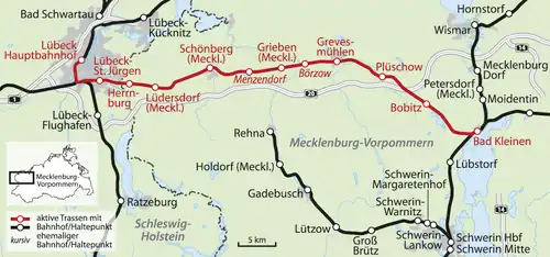 In the 1850s, the two grand duchies of Mecklenburg-Schwerin and Mecklenburg-Strelitz were planning an east–west route through their territory. This would connect in Lübeck to the Lübeck–Büchen line with Kleinen on the Hagenow–Wismar line and run over the existing Bad Kleinen–Rostock railway to Bützow and continue to Güstrow and Neubrandenburg. From there it would run via Strasburg over the modern Polish border to Szczecin (then called Stettin). While the middle section was intended to be a state railway, the western section from Bad Kleinen to Lübeck would be built and operated by a private company.