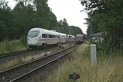 Copenhagen–Hamburg ICE passing Neustadt-Lübeck Regionalbahn service in Haffkrug station