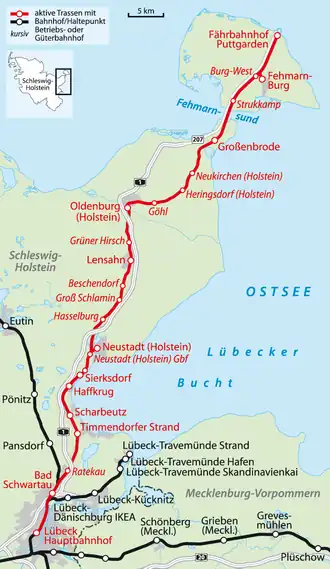 The tracks of the Kiel–Lübeck railway are used from Lübeck to Bad Schwartau. The line then runs along the Baltic coast through Timmendorfer Strand, Scharbeutz, Haffkrug and Sierksdorf. In the Neustadt in Holstein freight yard a branch line separates and runs to Neustadt station. The main line continues through eastern Holstein and runs via Lensahn, Oldenburg in Holstein, Großenbrode and after crossing the Fehmarn Sound on the Fehmarn Sound Bridge it ends at Puttgarden station on Fehmarn.