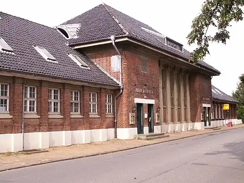 The station was built by the Lübeck-Büchen Railway Company (Lübeck-Büchener Eisenbahn, LBE), which opened the railway from Lübeck to Travemünde in 1882. It originally ended at Travemünde Hafen station, but the line was extended to Travemünde Strand station in 1898. A three km-long branch line from Travemünde Hafen station to Niendorf on the Baltic Sea was opened in 1913 to improve access to this tourist spot. As part of this work a new station building was built to a design by Fritz Klingholz, who had also designed the new Travemünde Strand station a little earlier. The branch line to Niendorf, however, was closed in 1974. The station building was sold in 1996 and was used as a restaurant until 2014. The station, which has been heritage-listed since 1992,[3] was modernised in 2004 and a new outdoor platform was built on the former track 1 next to the former station building.[4] The island platform on tracks 2 and 3 was abandoned. The freight tracks with a free loading track and loading ramp west of the entrance building (tracks 12 and 13) and the tracks north of the platforms (track 4–8) were abandoned and are no longer connected and have been partly dismantled. The station and the track have been electrified since 2008.