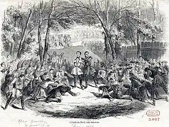 Meyerbeer and his librettist Eugène Scribe had presented sensationally successful French grand operas at the Paris Opéra. After the tremendous success of their Le prophète in 1849, Émile Perrin, director of the Opéra-Comique, invited Meyerbeer to compose a work in that genre for his theatre. Meyerbeer had long wanted to try his hand at this typically French style of work, and he decided to adapt his German singspiel Ein Feldlager in Schlesien, presented in Berlin in 1844, for that purpose.[3] Ein Feldlager in Schlesien, a celebration of the Hohenzollern dynasty ruling in Berlin and their illustrious ancestor Frederick the Great, had already been adapted into a piece for Vienna under the title Vielka in 1847 - Vienna being the capital of the ruling Habsburg dynasty, a glorification of the Hohenzollerns would not have been appropriate.[4]