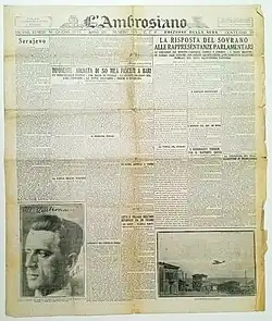 In 1930 the property was taken over by the Società Anonima Milanese Editrice (SAME), chaired by Arnaldo Mussolini.[3] At the beginning of the new decade, L'Ambrosiano introduced a literary page every Wednesday, inaugurating a tradition that was later taken up by many other Italian newspapers. A newspaper always open to innovation, in 1938 the change of format was also experimented, adopting a tabloid, with the doubling of the foliation to 12 pages.