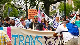 In 2004 the San Diego chapter of Gay, Lesbian and Straight Education Network (GLSEN) worked with San Diego Youth Pride coordinators to organize a Day of Silence throughout the county.[52] In 2005, Decatur (Georgia) Youth Pride participated in a counter-demonstration against Westboro Baptist Church (led by church head Fred Phelps' daughter Shirley Phelps-Roper), who were "greeting students and faculty as they arrived with words such as 'God hates fag enablers' and 'Thank God for 9/11'" at ten locations.[53] In 2008 Chicago's Youth Pride Center, primarily serving "LGBT youth of color", opened a temporary location and planned to move into their new building on Chicago's South Side in 2010.[54] In 2009, the Utah Pride Center held an event to coincide with Youth Pride Walk 2009, a "cross-country walk by two Utah women trying to draw attention to the problems faced by homeless LGBT youth".[55] In August 2010 the first Hollywood Youth Pride was held, focusing on the "large number of homeless LGBT youth living on Los Angeles streets."[56] According to a 2007 report, "Of the estimated 1.6 million homeless American youth, between 20 and 40 percent identify as lesbian, gay, bisexual or transgender".[57] At larger pride parades and festivals there are often LGBTQ+ or queer youth contingents, and some festivals designate safe spaces for young people.[58][59]