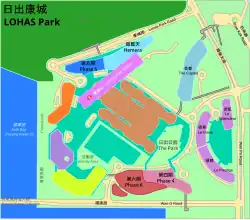 The 3,550,000 square feet (330,000 m2) estate is divided into 13 phases, composing of 50 high-rise residential towers, offering 21,500 apartments to accommodate 58,000 residents in the site area, which are to be completed before 2025. These will sit above the MTR LOHAS Park station.[1] The gross floor area (GFA) for domestic purposes is up to 1.6 million square metres, and retail GFA will occupy up to 50,000 m2[2]