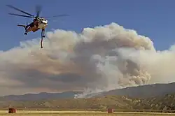 A S-64 Skycrane helicopter drops flame retardant on the fire