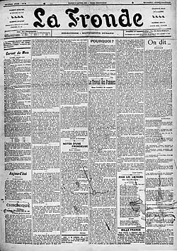 La Fronde (The Sling) was a French feminist newspaper first published in Paris on 9 December 1897 by activist Marguerite Durand (1864–1936). Durand,[1] a well known actress and journalist, used her high-profile image to attract many notable Parisian women to contribute articles to her daily newspaper, which was the first of its kind in France to be run and written entirely by women. She also had experience on other reputable publications, including La Presse and Le Figaro.[2]