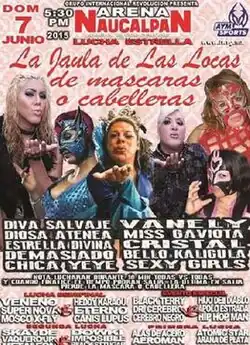 La Jaula de Las Locas (Spanish lit. "The Cage of the Crazy Ones", a reference to the Spanish title of La Cage aux Folles) was a special professional wrestling event produced by the International Wrestling Revolution Group (IWRG), that took place on June 7, 2015 at Arena Naucalpan in Naucalpan, State of Mexico. The focal point of the show and the inspiration for the event name was the main event steel cage match, an inter-gender match that saw both female wrestlers and male Exótico (drag wrestlers) compete against each other. The cage match was contested under Luchas de Apuestas, or "bet match", rules where the last wrestler in the cage would be deemed the loser, losing either their wrestling mask or their hair if they were already unmasked.