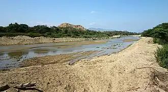 La Leche arises off the northern slopes of Mount Choicopico, 06°13′19″S 079°4′59″W / 6.22194°S 79.08306°W, at an altitude of 4,230 metres (13,878 ft) in Ferreñafe Province, of Lambayeque Region.[2] Its two main tributaries are the Moyán and the Sangana rivers, both right-hand tributaries.[2] Formerly the river ran parallel to the Motupe River as it entered the saline Sechura Desert; however, due to stream capture it now has the Motupe River flowing into its bed at 06°26′08″S 079°56′02″W / 6.43556°S 79.93389°W, with the resultant river being called the Motupe.[3] During the rainy season, mid November to mid April, but especially during El Niño events,[4] La Leche can experience severe flooding, and in some years by the end of the dry season it can almost disappear.[2] Traditionally stone levees were used to try to control the flooding,[5] but in the 21st century upland dams are being used.[2]