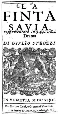 La finta savia is a 1643 drama by Giulio Strozzi written for the Teatro Santi Giovanni e Paolo with music by Filiberto Laurenzi. It is a sequel to Strozzi's La finta pazza (1641) whi was set to music by Francesco Sacrati.[1] The music was mainly by Laurenzi but was supplemented in act 1 with scenes 3 to 5, 10 and 12 by Tarquinio Merula, in scene 6 mainly by Arcangelo Crivelli except for a canzonetta by Laurenzi. In act 1, scenes 2 and 3 were by Crivelli and in act 3 scenes 1 and 7 to 9 by Benedetto Ferrari.[2]