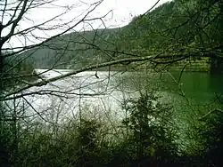 The lac de Sylans fills part of the Nantua water gap, which was formed during the last glacial era. The formation of the lake itself is much more recent; it is the result of the collapse of the cliff on the Northern side of the valley a few centuries ago.[1] This huge landslide partially blocked the valley between the ice factory and the source of the Doye, above les Neyrolles, blocking the river that was flowing along what is now the bed of the lake, causing the lake to form. Today the water percolates through the landslide debris to form the source of the Doye.[2]