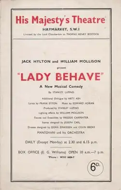Lady Behave is a 1941 British stage musical written by Stanley Lupino with music by Edward Horan. In the original West End production at His Majesty's Theatre, Lupino starred alongside Sally Gray who had appeared with him in a number of films. Pat Kirkwood, Judy Kelly, Hartley Power and Judy Campbell also featured in other roles during its run.[1] It is set in Hollywood where a stuntman can't get his girlfriend to marry him until she has made a success in films.