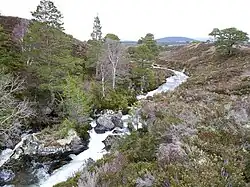 Continuing north the Laoigh crosses the Dee–Avon watershed at 740 metres (2,430 ft) and descends to the Fords of Avon refuge, another 4 kilometres (2.5 mi). Here the line of the Laoigh is crossed by the River Avon flowing west–east down from Loch A'an.[2][7] Despite the stepping stones over the Avon, it may not be possible to cross safely so it may be necessary to go upstream past the Shelter Stone and make a crossing of Garbh Uisge Mor at the head of Loch A'an before returning to Fords of Avon but on the other side of the river. This adds nearly 10 kilometres (6 miles) to the journey.[5] Ascending again to 792 metres (2,598 ft) the route continues north to Bynack Stable, 9 kilometres (5.6 mi) from Fords of Avon.[2][7]