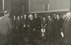 Prime Minister Lajos Dinnyés, awards Lajos Stöckler the Officers Cross Order of Merit of the Republic of Hungary in Parliament. Behind Stöckler with a moustache is Miksa Domonkos.[23] On the other side of the woman next to Domonkos is Dr. Laszlo Benedek head physician. May 1948