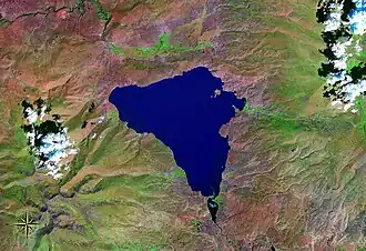 Lake Çıldır (Turkish: Çıldır Gölü; Georgian: ჩრდილი, ჩრდილის ტბა, Črdilis tba, meaning "lake of shadows", Armenian: Ծովակ Հիւսիսոյ, Tsovak Hyusiso, meaning "small sea of the north", Armenian: Պաղկացի լիճ, Paghkatsi lich, meaning "cold lake"), is a large freshwater lake in the provinces of Ardahan and Kars in northeastern Turkey. It is located close to the borders with Georgia and Armenia. Lake Çıldır is located at an elevation of approximately 1,959 m (6,427 ft) and is surrounded by a mountainous region. It has an area of 123 km2 (47 sq mi) and a maximum depth of about 42 m (138 ft). Water from the lake is used for irrigation.[1] The lake freezes over in the winter.
