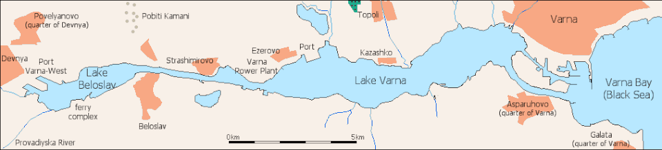 Lake Beloslav (Bulgarian: Белославско езеро) is a liman, which connected by a navigation canal with Lake Varna. Before the canal was built the lake was freshwater, but now the water is brackish. The rivers Devnya and Provadiyska flow into Lake Beloslav. The area of the liman is about 10 square km, with a width of 0.5-3.5 km, maximal depth 14 m, and salinity of about 10‰.
