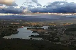 The lake contains 33,000,000 cubic metres (27,000 acre⋅ft) of water with a surface area of 6.64 square kilometres (2.56 sq mi). It is 11 kilometres (6.8 mi) long, 1.2 kilometres (0.75 mi) wide at its widest point, has a shoreline of 40.5 kilometres (25.2 mi)[48][49] and a water level of 555.93 metres (1,823.9 ft) above sea level.[50]