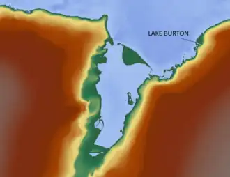 Lake Burton is located on the Ingrid Christensen Coast in Princess Elizabeth Land in Eastern Antarctica on roughly the same longitude as central India. This area of the coastline lies between Jennings Promontory, at 72°33'E, and the western end of the West Ice Shelf at 81°24'E in the western half of Princess Elizabeth Land, just east of Amery Ice Shelf. The lake is named after H. R. Burton, a biologist working in the Vestfold Hills of Antarctica.[1][2] The lake, formerly an arm of the sea,[3] is a dominant feature of the western side of the Vestfold Hills area in what is known as the Mule Peninsula.[4] The lake lies to the northwest of the Sorsdal Glacier, southeast of Oldroyd Island and southwest of the Tryne Islands. The lake has a surface area of 1.35 km2 (0.52 sq mi), a volume of 9.69 million m3, a maximum depth of 18.3 metres (60 ft) and a mean depth of 7.16 metres (23.5 ft).[5][6][7]