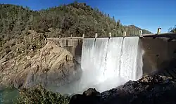The North Fork Dam (CA10110) is a variable angle arch dam. There are three types of arch dams: constant radius, variable radius, and constant angle arch dams. Variable angle arch dams are dams which have varying curvature along their horizontal profile. The dam rises 155 feet above the lowest foundation and has a crest elevation of 715 feet above sea level. The crest length is 620 feet and the crown thickness varies from 22 feet at the base to 6.8 feet at the top. The North Fork Dam also serves as a 15 MW, 40 GWh run-of-river hydroelectric project.[4] Lake Clementine was created when the construction of the dam was completed. The reservoir has a capacity of 14,700 acre-feet, and a surface area of 280 acres. The reservoir is approximately 3.5 miles long and has very narrow steep canyon walls.[5]
