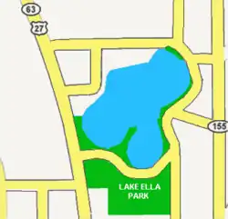Lake Ella is a lake in central Tallahassee, Florida on US 27 just south of Tharpe Street, and just north of Downtown. Lake Ella has an area of 12 acres (49,000 m2) and a perimeter 0.6 miles. Once used for cattle, it now has three fountains and is used for recreation, flood protection, and stormwater pollution control.