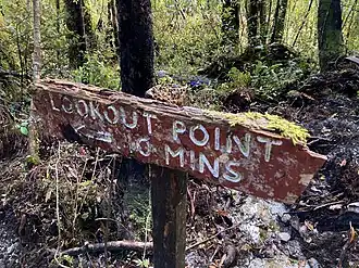 When the northern access road to the Fox Glacier was destroyed by a landslide in February 2019, the government announced a $3.9 million package to offset the loss to tourism by enhancing or upgrading other attractions in the area. One of those selected was the Lake Gault Track.[9] What had been a muddy and challenging 3–5 hour return hike was fully drained and gravelled to an "easy" grade by late 2020. A lookout point and bench at the lakeside allows views of the mountains, though these are best seen early in the morning of a calm, clear day.[6]