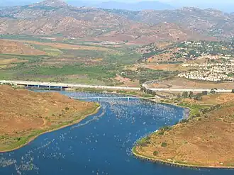 ![]() Lake Hodges looking east with views of the 2009 pedestrian bridge, Interstate 15's Lake Hodges Bridge, and the San Pasqual Valley in the distance | |