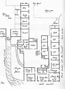 The two main wings of the house form an L-shaped structure, the living rooms facing west with views over the lake and the bedroom wing facing south to avoid the heat of the sun. Adjacent to the courtyard behind were the kitchen, accommodation for male visitors (the bachelors hall), servants quarters, laundry store, wine cellar, dairy and the underground cistern that provided the household water supply. At the eastern end of the bedroom wing were a bathroom, privies and a boiler for providing hot water in the bathroom. The surviving standing remains comprise but a small part of what was once a 22-room mansion and its associated buildings.[34]