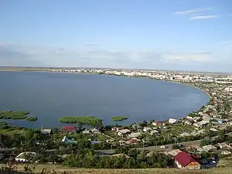 Lake Kopa (Kazakh: Қопа, Qopa; [qopɑ]) is a lake in the city of Kokshetau, located on the territory of Akmola Region close to the foot of Kokshetau Elevation in the northern part of Kazakhstan.[1] Its elevation is 223.8 m (734 ft) above sea level and has a maximum depth of about 6 m. It is 5.6 km long and 12 km wide. The total surface area of it the lake is about 14 km2 (5.4 sq mi) depending on water level. It is fed by 2 rivers and is drained by the Shagalaly. The area of Lake Kopa fluctuates year to year, but in recent years the size of the lake has been decreasing overall. Kopa is used for fishery.