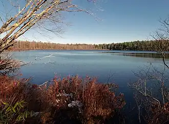 When Lake Lacawac was first formed it was 156 acres (63 ha) in size, but is now about 52 acres (21 ha) in size.[8] This is likely due to the increasing temperatures that have been linked to climate change over the late 20th century. The shape of this lake has been compared to a half moon shape, and two different types of habitats can be observed within the lake. One of the habitats that is located on the eastern and southern shores is sandy and barren due to the continuous waves that break down the sandstone and washes away the plant matter in that area.[3] The other habitat can be seen on the north and west shores and has been described as a bog area or wetland because of the many trees that have fallen over the years and the plant material that has been deteriorating.[3]
