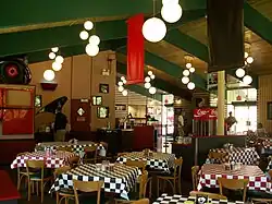 The interior is arranged with the main dining room in the north end, the kitchen in the middle, and the employees' dining room at the south end. A lunch counter was originally located next to the main entrance near the center of the building. The employees' dining room has been converted to office and storage use. Interior finishes were stained cedar batten panels and vinyl asbestos tile, with an open ceiling space. Original light fixtures by A.W. Pistol remain.[2]
