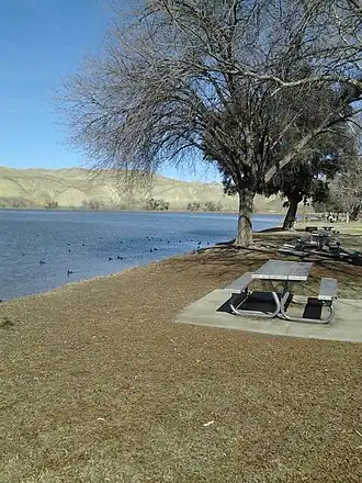 Lake Ming is a reservoir used for recreation purposes and owned by the Kern County Parks and Recreation Department.[2] Its height is 18 feet (5.5 m) with a length of 4,700 feet (1,400 m). Normal storage is 790 acre-feet (970 dam3). It drains an area of 0.6 square miles (1.6 km2). It has a surface area of 104 acres (42 ha). Other facilities located at the lake include picnic areas, restrooms, drinking fountains, and parking around the southern end. There is also playground equipment at the southeast end of the lake.[1][3] There is also an additional large picnic area located on top of a small hill east of the lake. Further east is a 28-acre (11 ha) campground.[3] It has 50 camp sites, each containing a picnic table and fire ring. A dump site and restroom are also available.