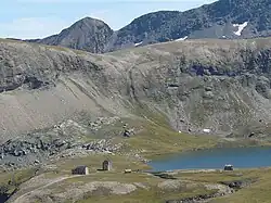 The lake is situated in the center of a wide basin defined to the west between the Cogne Valley and the Champorcher Valley, to the north by the divide between the latter and the Val Soana, and to the east by the ridge of Monte Rascias, which separates it from the Banchi valley.[2] Near the lake are the Rifugio Misérin and the Notre-Dame-des-Neiges sanctuary. The church is the destination at the beginning of August for a historic pilgrimage that brings together devotees from both the Val Soana (in Piedmont, south of the lake) and the Champorcher Valley.[3]