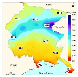 The climate is strongly influenced by the morphology of the territory. The area is subject to almost constant ventilation (sometimes strong), which results in the near-total absence of foggy or hazy days in the cold season. Conversely, in the summer months, sultry heat days are equally rare. The rainiest seasons are spring and autumn: the nearby ridges of the Giulian Prealps, blocking the path of low-pressure systems coming from the Mediterranean, cause the intense precipitations that characterize these periods. Summers, which do not experience the extreme temperatures of the Venetian Plain, are mitigated by frequent showers. This makes the area one of the rainiest in Italy (about 2,000 mm/year in Gemona, over 3,000 mm/year in nearby Uccea).[8]