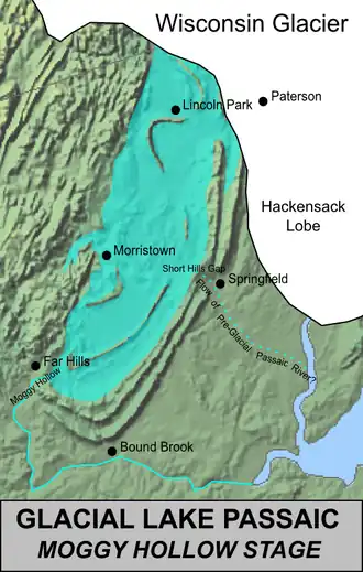 Lake Passaic was a prehistoric proglacial lake that existed in northern New Jersey in the United States at the end of the last ice age approximately 19,000–14,000 years ago.[1] The lake was formed of waters released by the retreating Wisconsin Glacier, which had pushed large quantities of earth and rock ahead of its advance, blocking the previous natural drainage of the ancestral Passaic River through a gap in the central Watchung Mountains. The lake persisted for several thousand years as melting ice and eroding moraine dams slowly drained the former lake basin. The effect of the lake's creation permanently altered the course of the Passaic River, forcing it to take a circuitous route through the northern Watchung Mountains before spilling out into the lower piedmont.