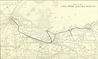 The LSE was formed in 1901 and was composed of four predecessor streetcar and interurban lines, all owned by the Everett-Moore Syndicate. The Lake Shore Electric operated a 60-mile route between Cleveland and Toledo. In 1907, the company constructed a cutoff between Sandusky and Fremont, Ohio, which reduced the distance between Cleveland and Toledo by five miles and decreased travel time by 30 minutes. The old and the new routes were operated with hourly passenger service where a two-car interurban from Cleveland separated at Sandusky and recoupled at Fremont to continue to Toledo. This service continued until 1939.[1]