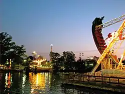Lake Winnepesaukah is modeled after a classic American fair theme with a midway layout featuring food, games, and amusement rides. The park's venue is the "Jukebox Junction," an open-air theater that is used for concerts and as a playground for children. The park expanded in 2013 with the addition of a water park called Soak Ya with several water attractions. The park also featured the only known working Eyerly Fly-O-Plane attraction in the United States until it closed in 2017. Family-oriented rides include the Wacky Factory, tilt-a-whirl, Matterhorn, balloon race, paratrooper, orbiter, pirate ship, scrambler, a ferris wheel, Genie, Fire Ball, bumper cars, paddle boats, a tour train, and several other family and thrill rides.[5][6] In 2005, several rides from an amusement park in Panama City Beach, Florida, were brought to Lake Winnie for its 80th birthday celebration. After the revival of Miracle Strip closed down, several of its rides permanently relocated to Lake Winnespesaukah, including The Bumble Bees, The Free Whale, Kiddie Boats and The Ferris Wheel.