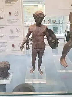 - ^ InEtruria.it: "This is highlighted by the existence in the votive offering of Hercle of Greek manufacture. It can be hypothesized that this offering was mainly associated with "soldiers" both on account of the statuette of Hercle (god connected to heroism and also to war) and that of the Warrior, not to mention the huge quantity of arrows."