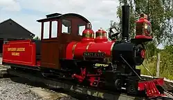 A dual gauge 10+14 in (260 mm) / 7+14 in (184 mm) light railway was established in the park in 1992, originally as a temporary layout.[3] A more permanent track was laid down in 1993, as the railway company was granted a three-year lease.[3] Five years later, a longer lease was negotiated and construction began on the two stations, Eastleigh Parkway and Monks Brook.[3] They were opened in 1999, although further work on the layout itself was carried out in 2000.[3] A tunnel was added in 2003, and Eastleigh Parkway station was extended in 2005 with the addition of a café and shop.[3]
