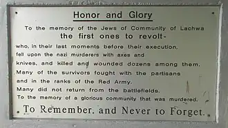 Germany invaded the Soviet Union in 1941, and German troops occupied Lakhva on July 8, 1941, two weeks after the start of Operation Barbarossa.[9] On April 1, 1942, the town's Jews were forcibly moved into a ghetto consisting of two streets and 45 houses, surrounded by a barbed-wire fence.[4][9] The ghetto housed roughly 2,350 people, with approximately 1 square meter for every resident.[7] The Ghetto was to be liquidated on September 3, 1942 and a Jewish underground resistance formed, led by Icchak Rochczyn.[10] When the Germans entered the ghetto, an uprising occurred, and members of the ghetto underground attacked the Germans. This battle is believed to represent one of the first,[2] and possibly the first,[3][4] Jewish ghetto uprisings of the Second World War. Approximately 650 Jews, including Rochczyn, were killed in the fighting and by the flames, and another 500 or so Jews were taken to the execution pits and shot. Six German soldiers and eight German and Ukrainian policemen were also killed. The ghetto fence was breached, and approximately 1000 Jews were able to escape. Approximately 90 residents of the ghetto survived the war.[4][9]