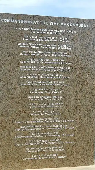 | Commands | Security Forces Headquarters – Central, Military Intelligence Corps, 52 Division, Director General - Operations & Security - OCDS, Infantry Training Centre - Minneriya, 58 Division, 62 Division, Area Headquarters - Welioya, Mechanized Infantry Brigade, SL Contingent United Nation Peace Keeping Operation Battalion, 553 Brigade, 524 Brigade, 8th Battalion - Sri Lanka Sinha Regiment, 7th Battalion - Sri Lanka Sinha Regiment, |