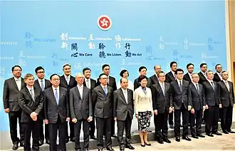 Carrie Lam announced her new cabinet on 21 June 2017, with six incumbent ministers keep their portfolios including the three top secretaries.[6] The cabinet was reshuffled twice in 2020 and 2021.