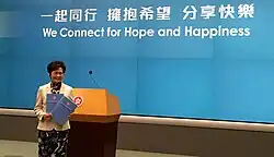 In the 2017 Chief Executive election, Lam received 777 votes in the 1,194-member Election Committee, beating former Financial Secretary John Tsang's 365 votes and retired judge Woo Kwok-hing's 21 votes. Lam was the first female Chief Executive in history, higher than Leung's 689 votes in the last election. She also became the first Chief Executive elected without being the most popular candidate, as she had been trailing behind Tsang in the polls.[1] She pledged to "heal the social divide" and "unite our society to move forward" in her victory speech.[2]