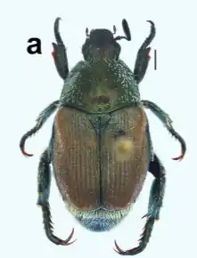 Adults reach a length of about 7.6–9.22 mm. The colour of the clypeus, frons, pronotum and scutellum is shiny green or brown with violet sparkles. The antennal club is dark brown. The pronotum has brown reddish tones in the lateral borders. The elytra and striae are brown yellowish, with the elytral suture and epipleura dark brown.