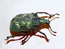 The iridescent green with golden reflections is a structural colour. It is created by the photonic crystal structure of its chitin scales.[1]