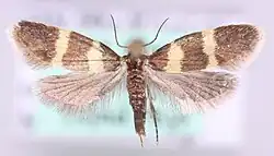 The wingspan is 9–11.5 mm.[2] Adults are on wing in May and June.