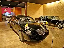 A 60 centimetres (24 in) stretched limousine version prototype was shown at the 2004 Geneva Motor Show having a length 5.49 m (216 in).[13] Made by Stola, it was named as the Stola S85 to celebrate the Stola company's 85th anniversary.[14] The car is equipped with a beige leather interior and electrically adjustable rear seats. The car also has a minibar with a refrigerator, a multimedia system with GPS navigation, internet access, fax machine, and a DVD player.[13] With a 230 PS (169 kW; 227 hp) V6 engine and all these extra features, the converted car weighs 2,030 kg (4,475 lb),[15] and can accelerate from 0 to 100 km/h (62 mph) in 9.2 seconds, with a top speed of 230 km/h (143 mph).[16]