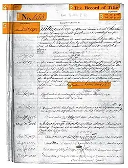 The register was divided into three main parts: one with details on the properties and their locations, one with details on the owners and sales, and one with details on mortgages and leases.[2] These were called "The Register of Estates of Indefeasible Title to Land", "The Record of Title to Lands on the Register", and "The Register of Mortgages and Incumbrances" respectively.[2]