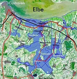 The Land Hadeln lies in the Lower Elbe region. Its proximity to the Elbe estuary and the North Sea brings with it the danger that, in the event of a dyke breach during a storm surge the area, which lies just above sea level, will suffer major flooding.